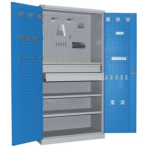 Sofame fém műhelyszekrény, 195 x 100 x 45 cm, szürke/kék, 2 polccal + fém burkolattal, 2 fiókkal |